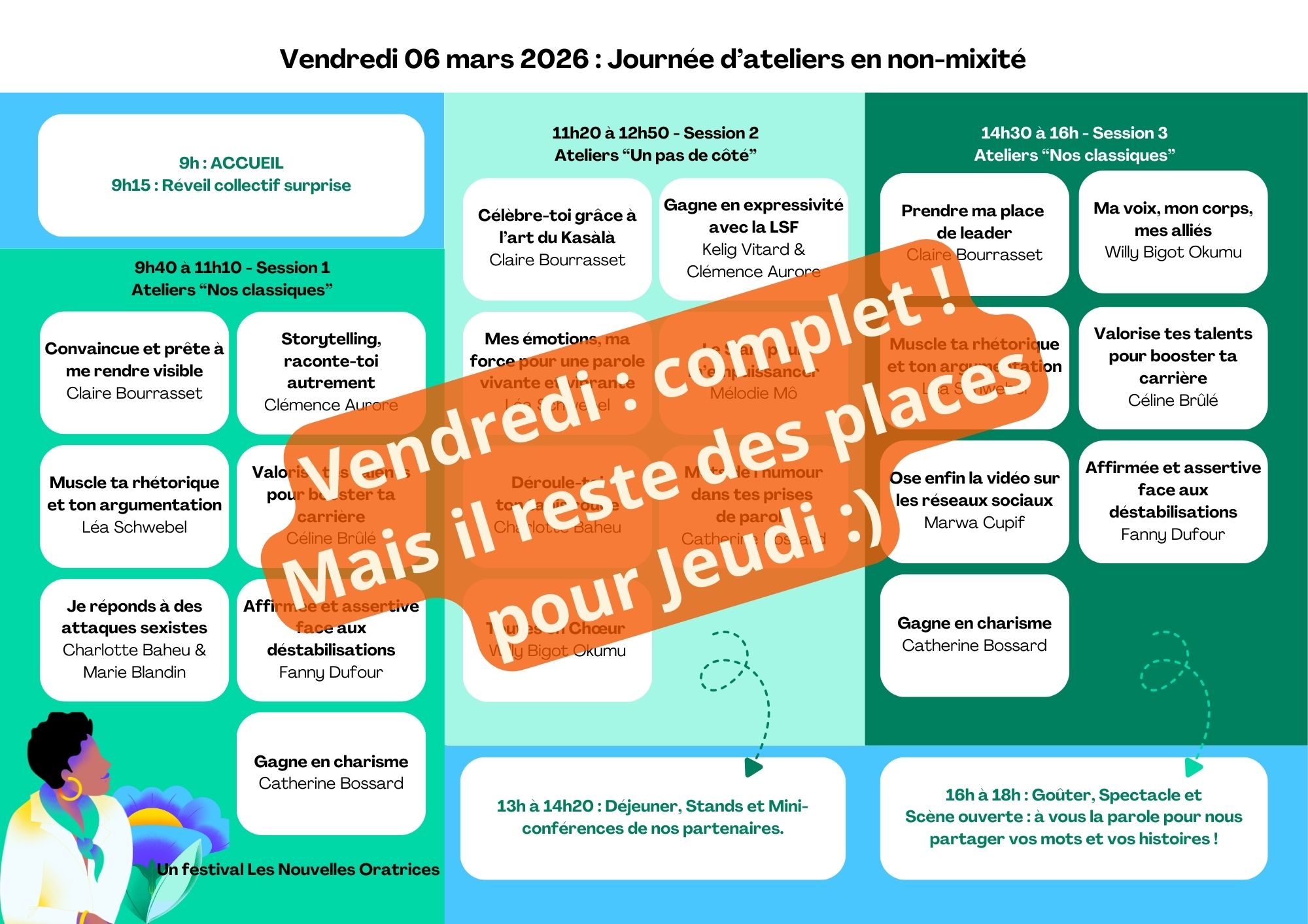 => Vendredi de 9h à 18h : Une journée dédiée aux femmes professionnelles, pour renforcer la confiance, la visibilité et l’affirmation de soi à travers des ateliers pratiques. Cette journée affiche déjà COMPLET ! Merci aux 90 femmes qui ont pris leur place <3